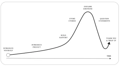 This diagram is a visual representation of the path of a typical HCD discovery interview. Use it as a guide for planning your own interviews, if you find it helpful. It is adapted from work from Stanford’s d.School and represents a path you may follow when conducting an interview.