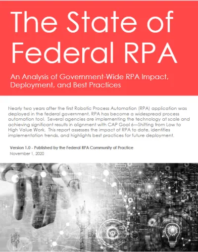 Published by the Federal RPA CoP, The State of Federal RPA provides a comprehensive and insightful analysis of the adoption and impact of RPA in the Federal Government. Based on detailed maturity assessments that the CoP conducts with government agencies, the report describes the maturity and growth of RPA Programs to convey agency progress in digital transformation and automation.